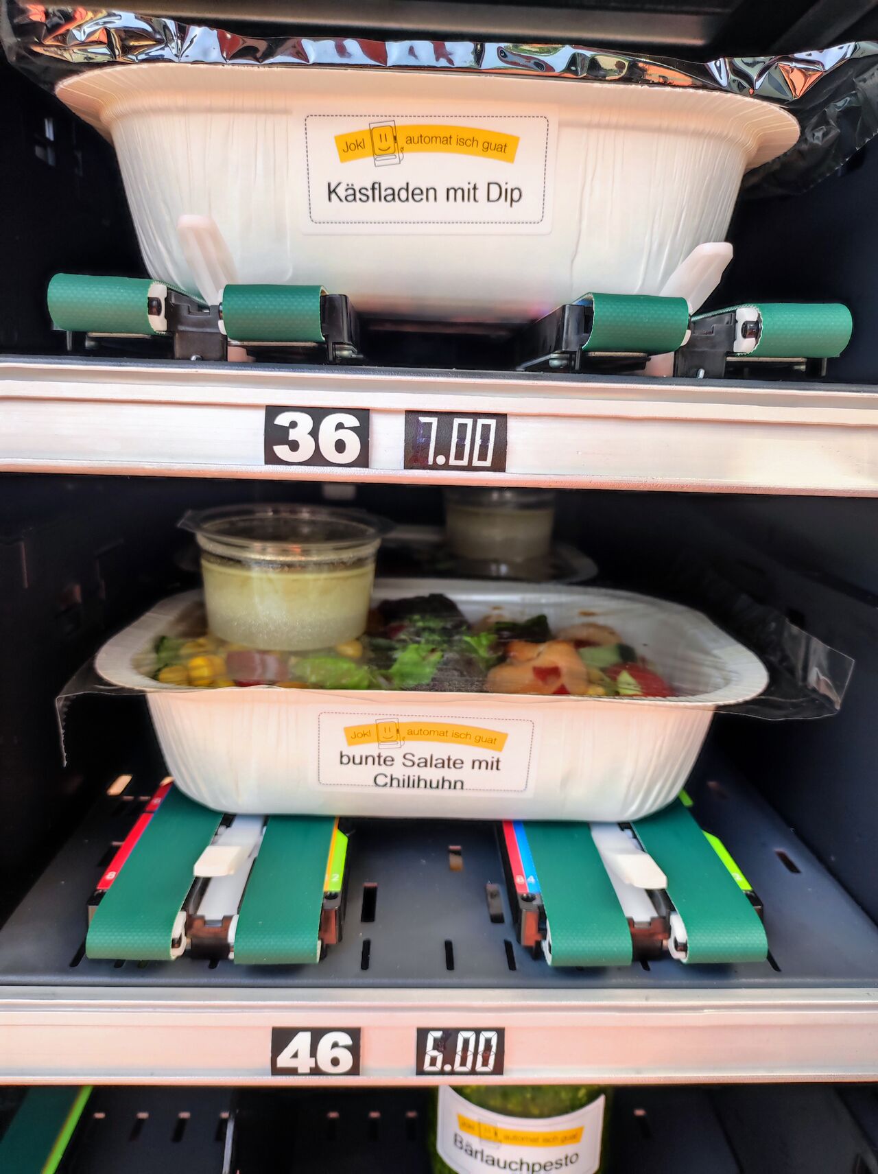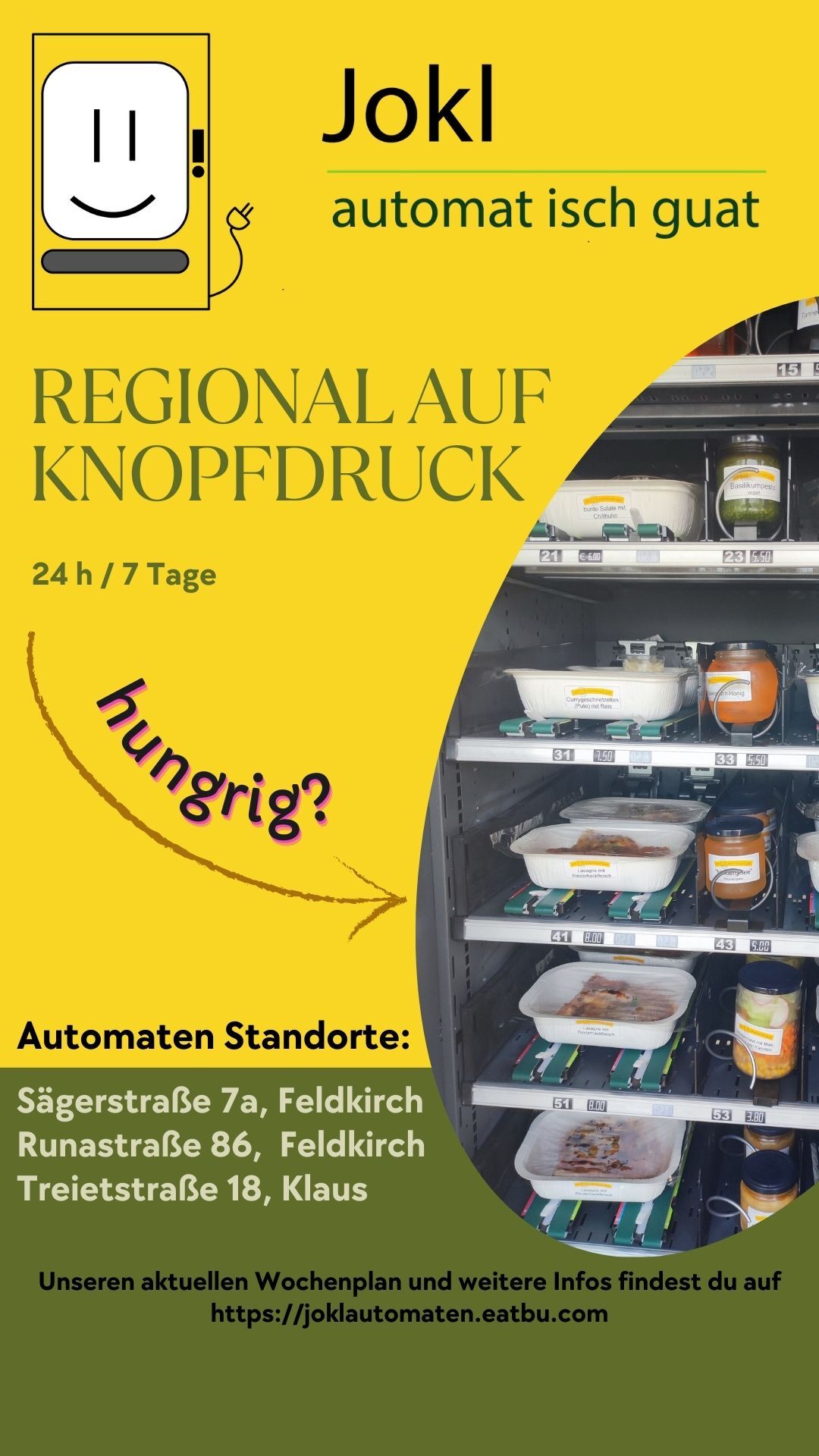 In unseren Jokl Automaten finden Sie regionales Essen auf Knopfdruck. Neben frischen, täglich wechselnden Menüs gibt es auch feine selbstgemachte Delikatessen. Rund um die Uhr, täglich frisch, zu fairen Preisen und direkt um`s Eck. Komm vorbei!